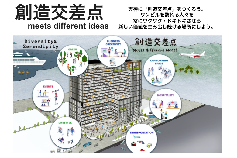 そこで、“天神を新たな価値を生み出す新しいまちへ”生まれ変わらせていくことを目指すことにしたのです。福岡は当時から「住みたいまちランキング」で上位に入り、アジアの玄関口としてのポテンシャルも高い。そんな土壌を生かして「創造の交差点」をつくろうと考えました。
