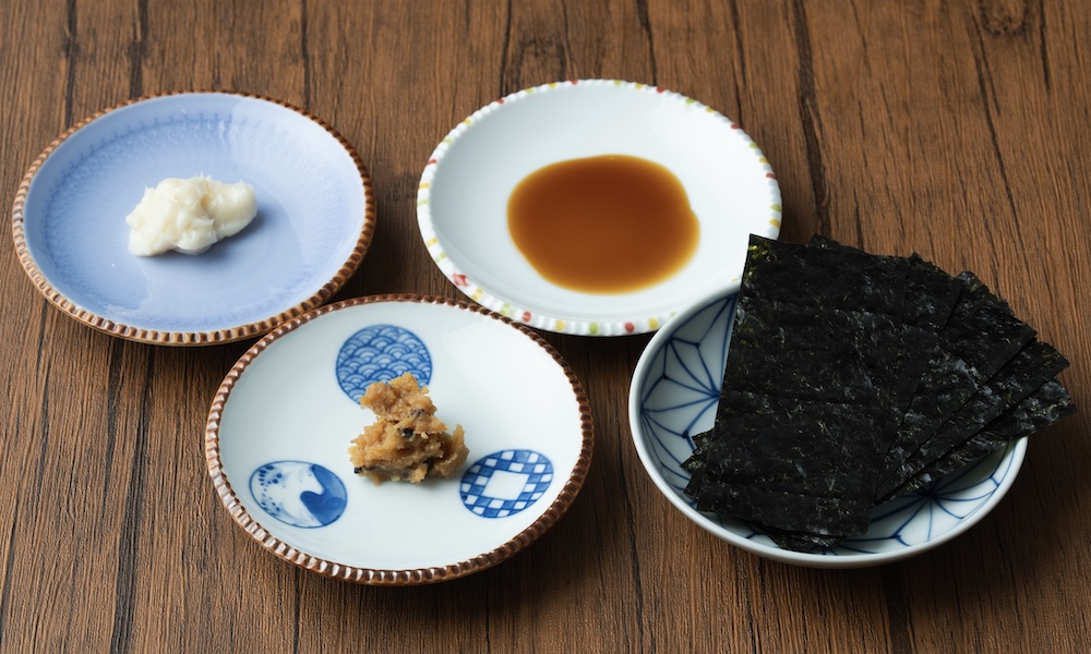 丸秀醤油の天然醸造「自然一だし醤油」と「十穀味噌」、有明海の恵みでもある三福海苔の焼海苔「一番摘み 潮彩」。さらに、酒蔵が多い土地ならではの副産物を活かしたMIFUKUAN(川原食品)の「柚子クリームチーズ粕漬」。