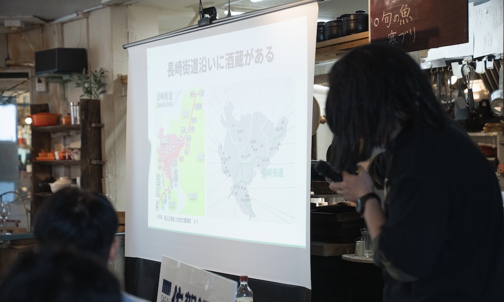 キノハチ先生が示した地図には、長崎街道(別名:シュガーロード)沿いに密集する酒蔵のプロット。江戸時代、長崎から砂糖が運ばれたこの道沿いでは、贅沢な砂糖を使った甘い味付けの料理が発展しました。