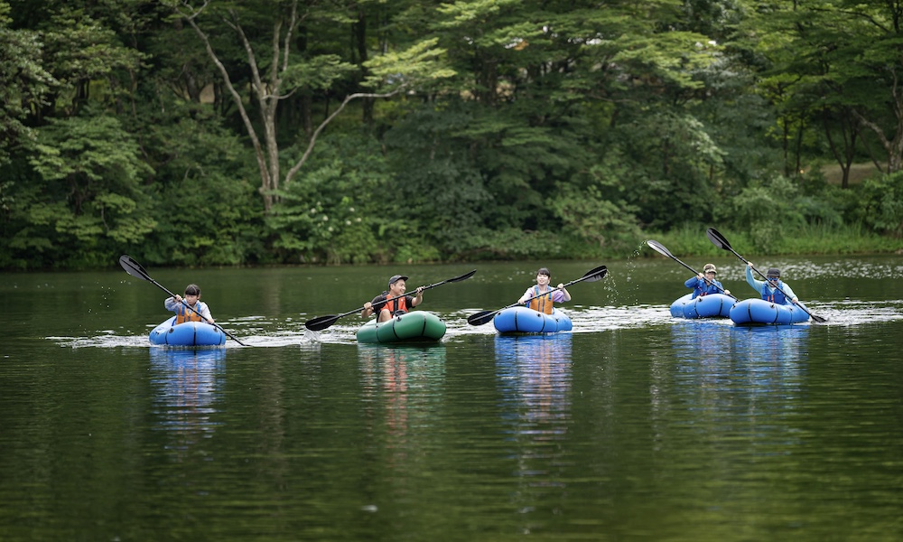 夏が近づくにつれてオススメ度が増すのが、「雲仙温泉街」から車で3分ほどの場所にある「白雲の池キャンプ場」のアウトドア・アクティビティ。ここでは、アラスカ荒野を旅するために開発された小型ボート「パッククラフト」に挑戦! こちらも標高700m&水上をわたる風で涼しさ抜群です。