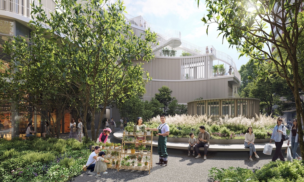 こちら(パース①)が全体のイメージパースになります。右奥が博多駅で、その手前に見えているのが、今回整備される店舗棟です。この建物と連動する「立体園路」と呼んでいる動線を設けることで、都市の限られたスペースの中に緑や居場所を増やしていく。そこが今回の大きなポイントなんです。