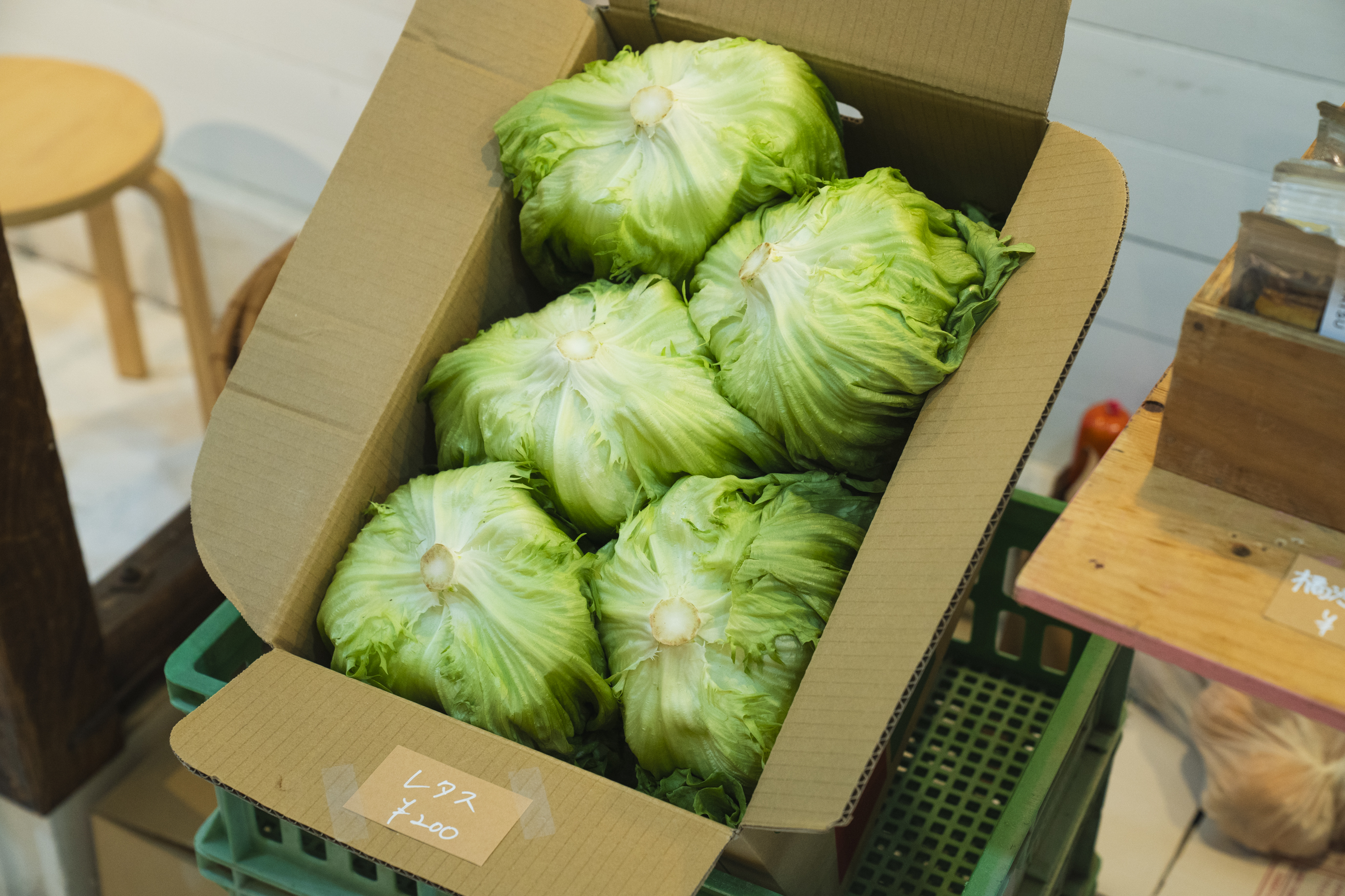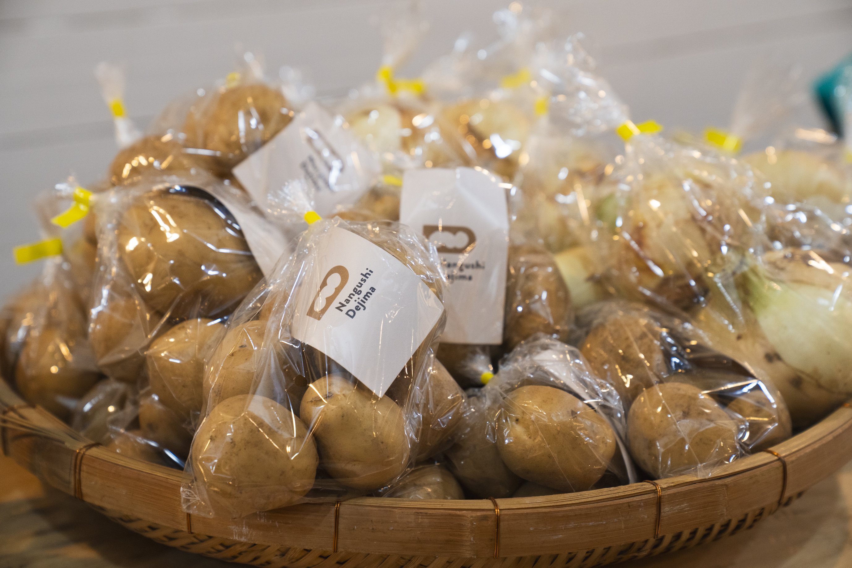 アナバナ編集部内には、雲仙のおいしいものを取り揃えたマルシェが登場。デジマプロジェクトのじゃがいも、レタス、雲仙市の名産品などなどが並びました。生産者のみなさんに、食材が育つ雲仙の風土や地元ならではの食べ方を聞くお客さんも。