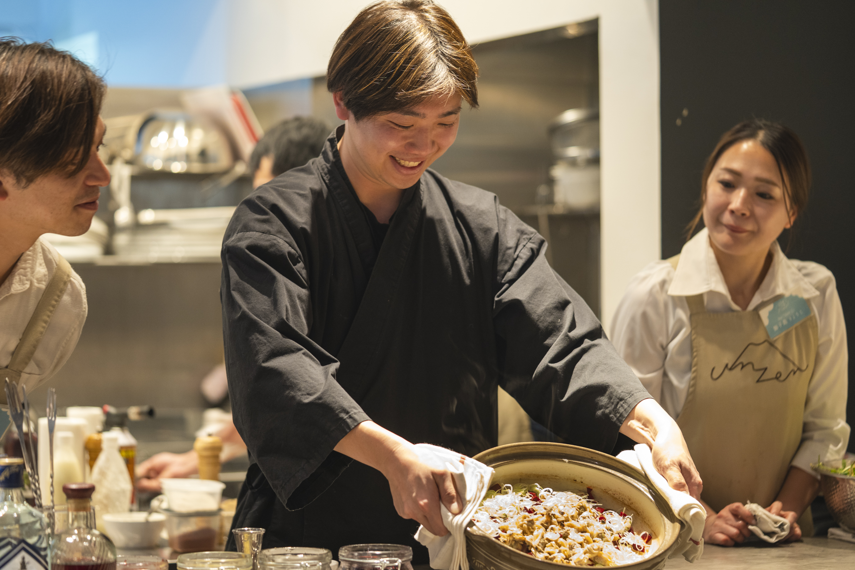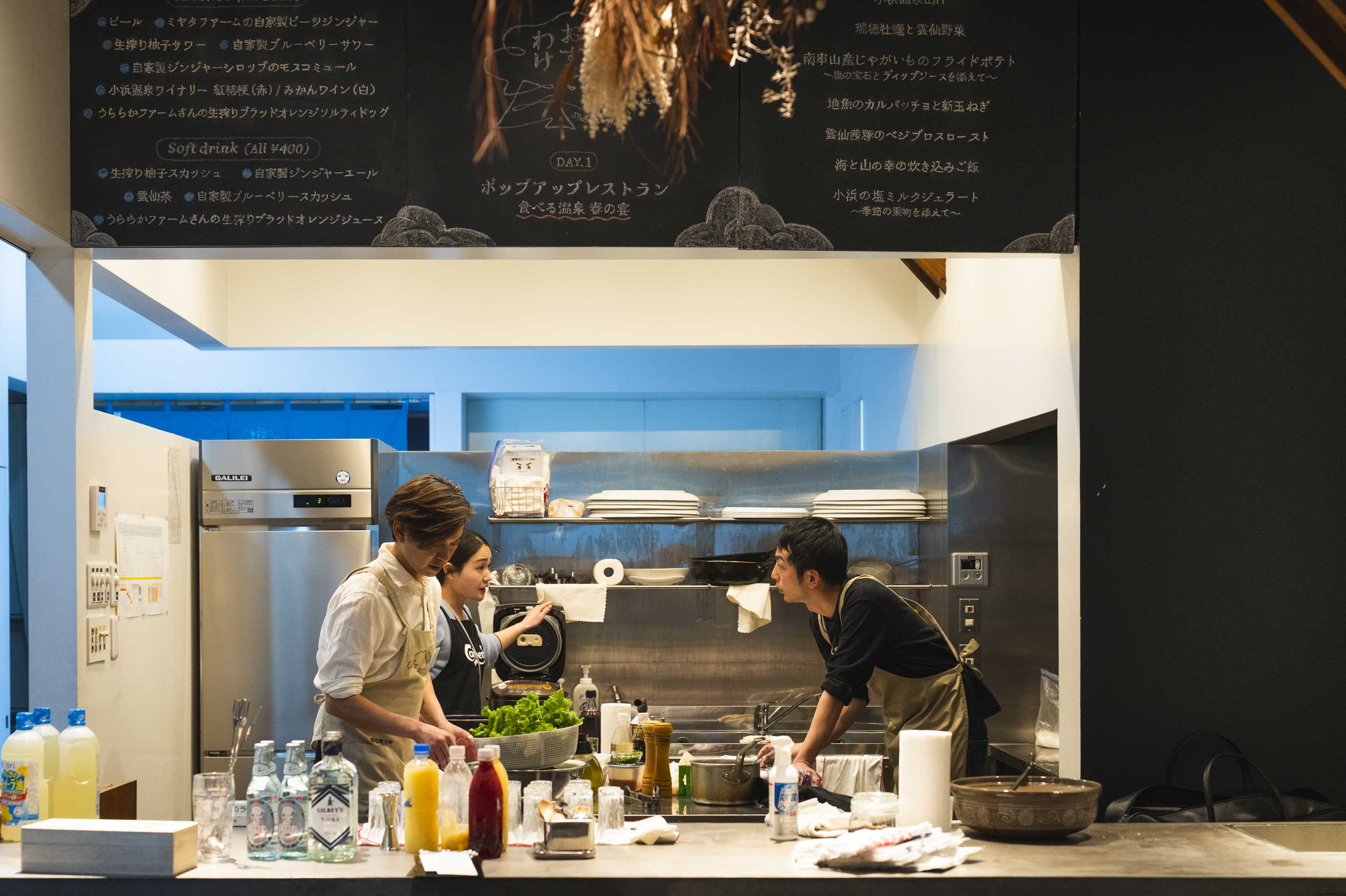 1日目のポップアップレストランで腕を振るったのは、雲仙市の若手シェフ・獅子島 薫さん(BAR Lion-J オーナーシェフ)と宮﨑貴仁さん(雲仙温泉の旅館の和食料理人)。獅子島さんの奥さんも応援に駆けつけ、仕込みにチカラが入ります。