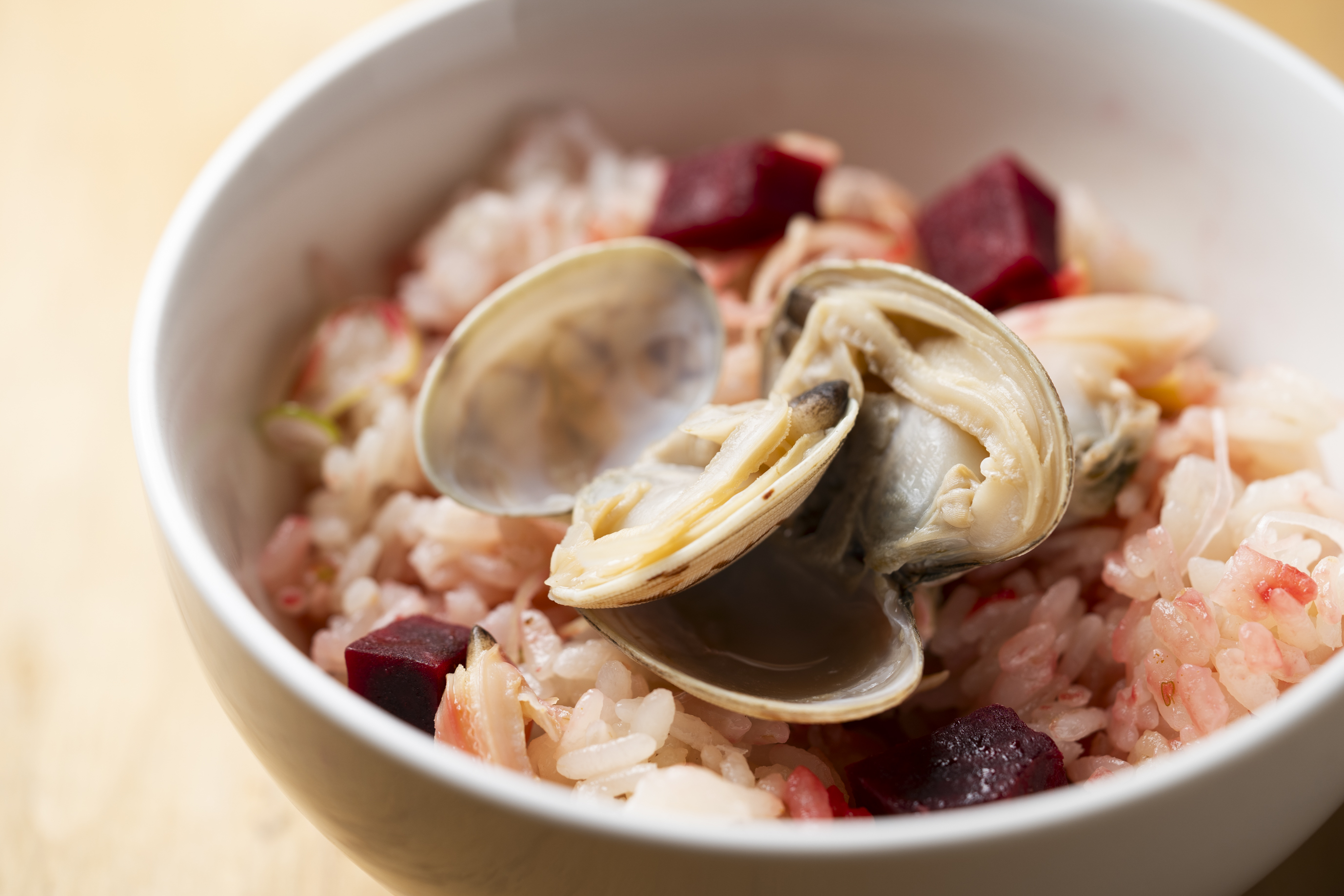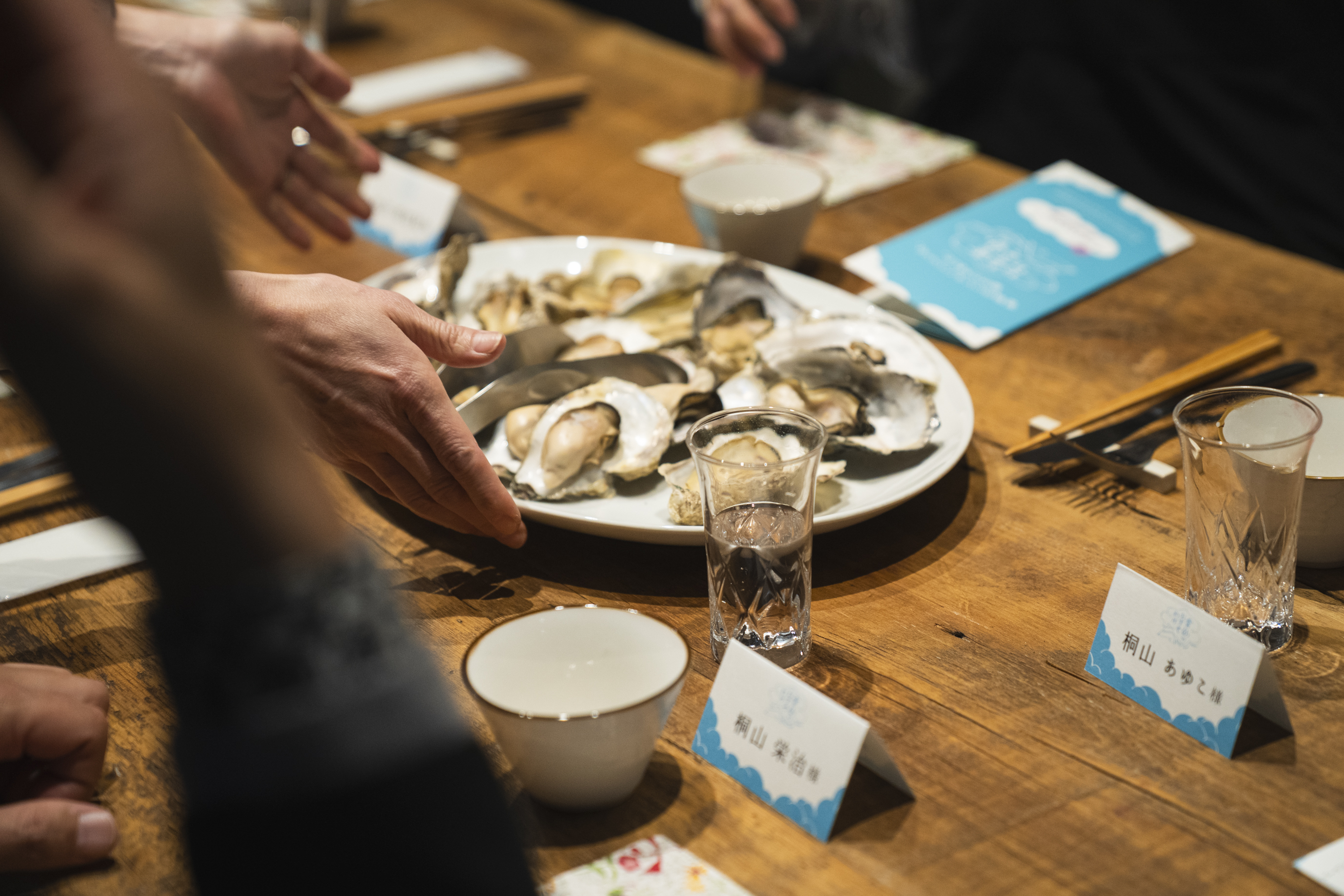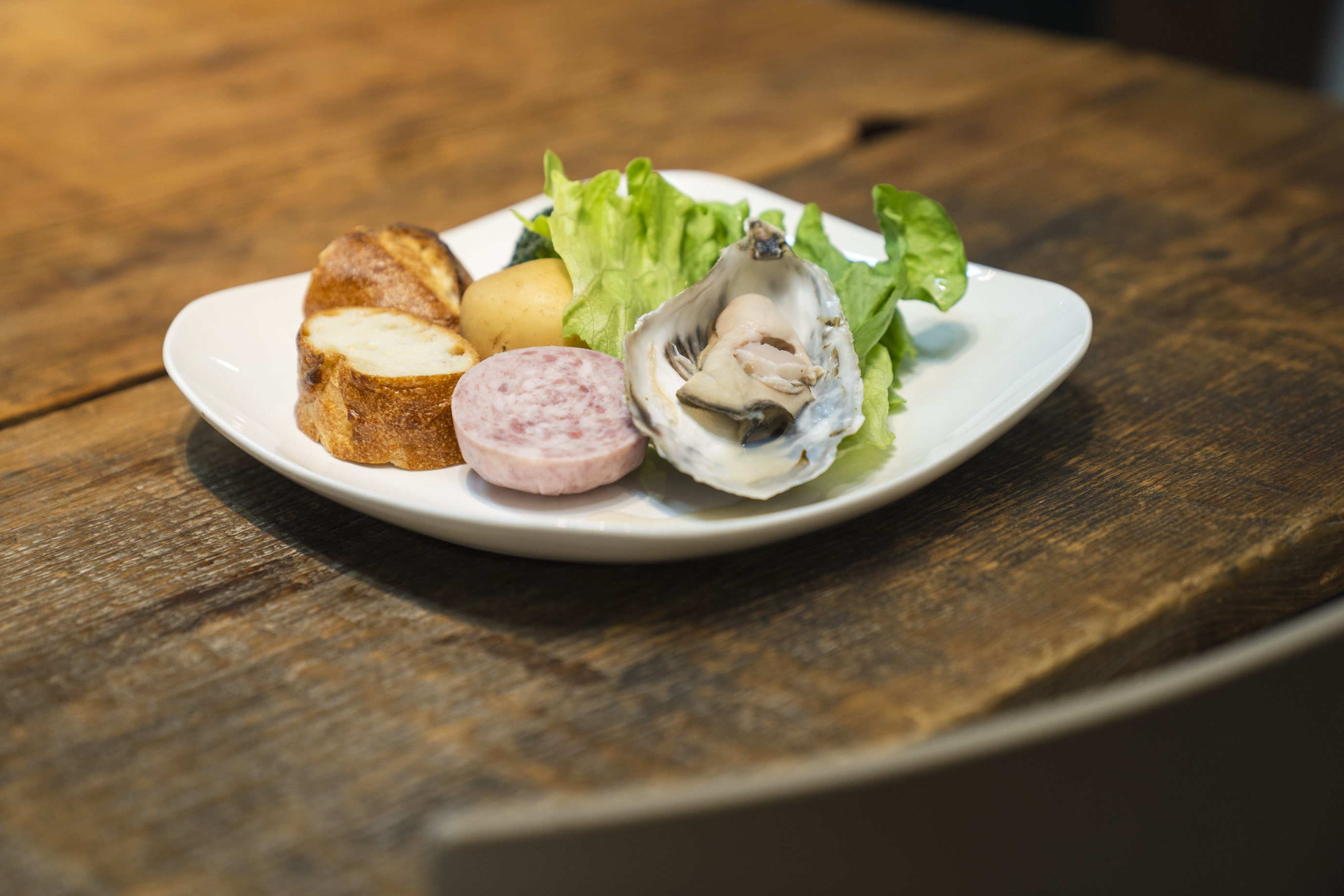 お次は小浜温泉の「温泉蒸し」。雲仙からタンクに詰めて運んできた温泉水で「瑞穂産かきと雲仙野菜」を蒸し上げました。牡蠣は温泉水のチカラで、しっとり味わい深く。温泉水のかすかな塩味が野菜の甘味を引き立てます。