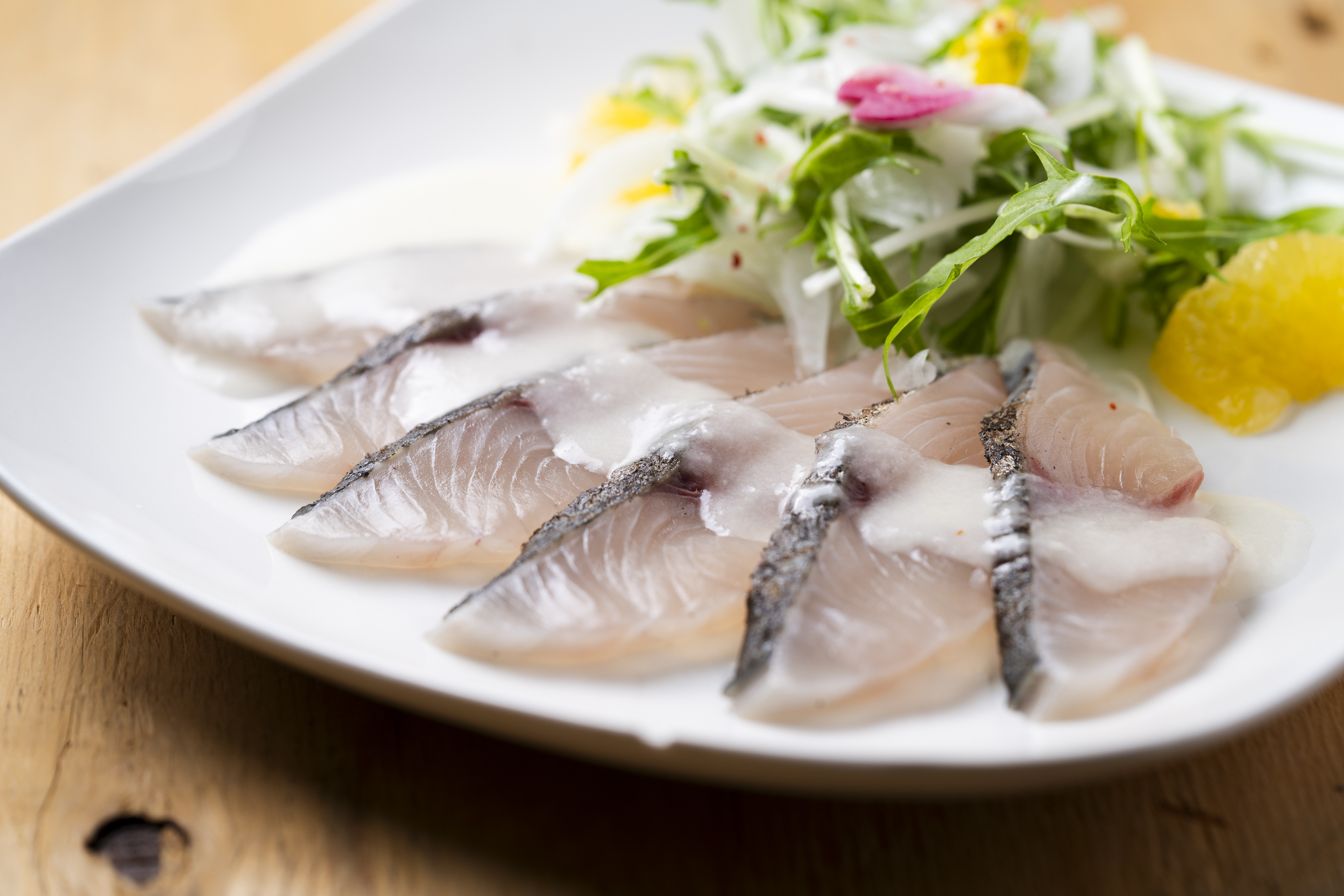 4品目は「地魚のカルパッチョと新玉ねぎ」。橘湾でとれた大きなサワラが1人前6切れとたっぷりです。料理人の獅子島さんに、こんな大盤振る舞いしていいんですか!?と聞けば、「お手頃な価格ですっごくいいサワラを見つけたから、いっぱい食べてもらいたくて」とニコニコ笑顔。ふんわりやわらかなサワラにシャキシャキの新玉ねぎとエディブルフラワー。サワラは漢字で書くと鰆です。春の宴にぴったりの魚料理でした。