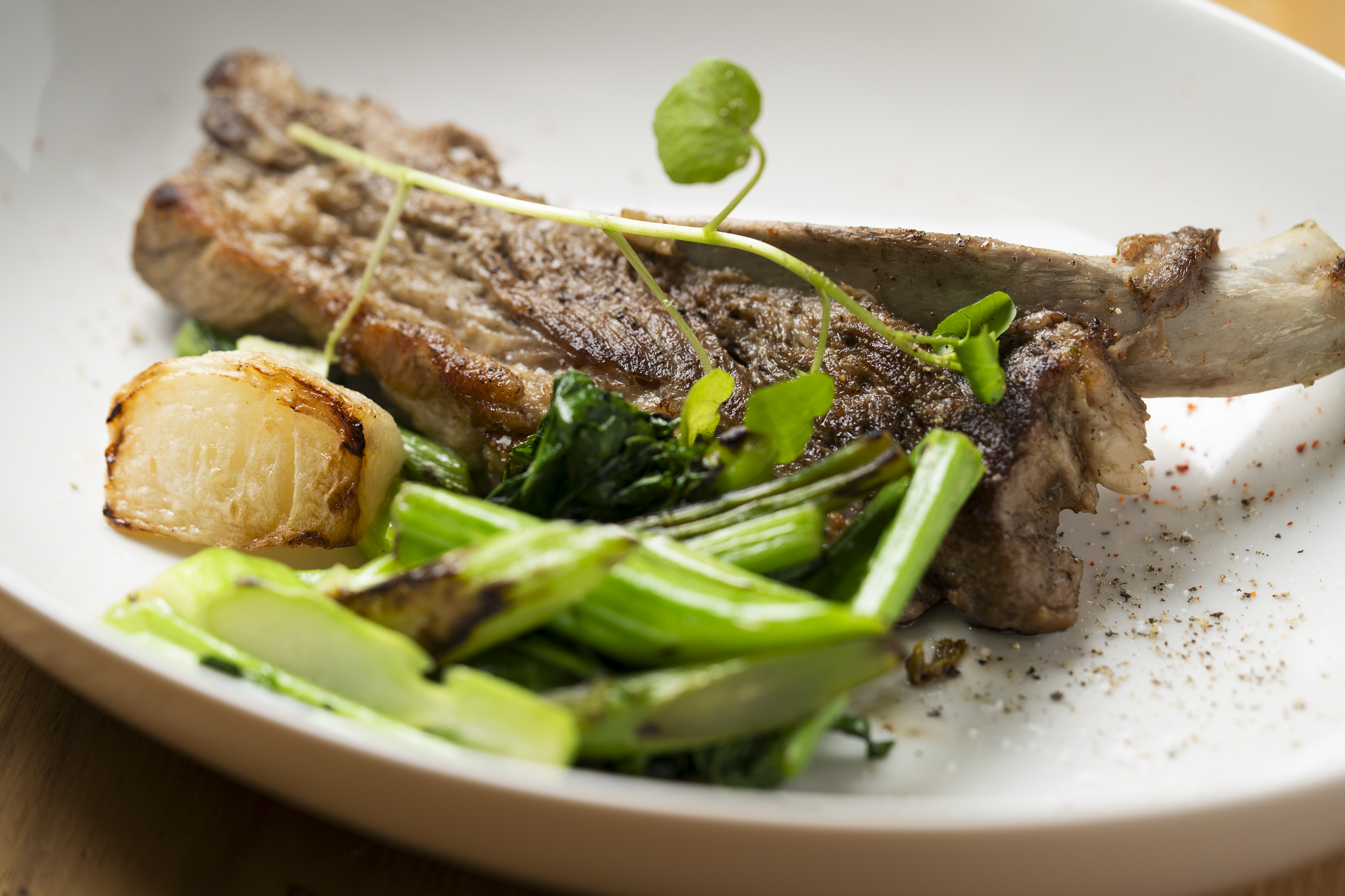 温泉ベジブロスで煮込んでローストしているので、骨から身がホロッとはずれます。付け合せの野菜ももちろん雲仙産