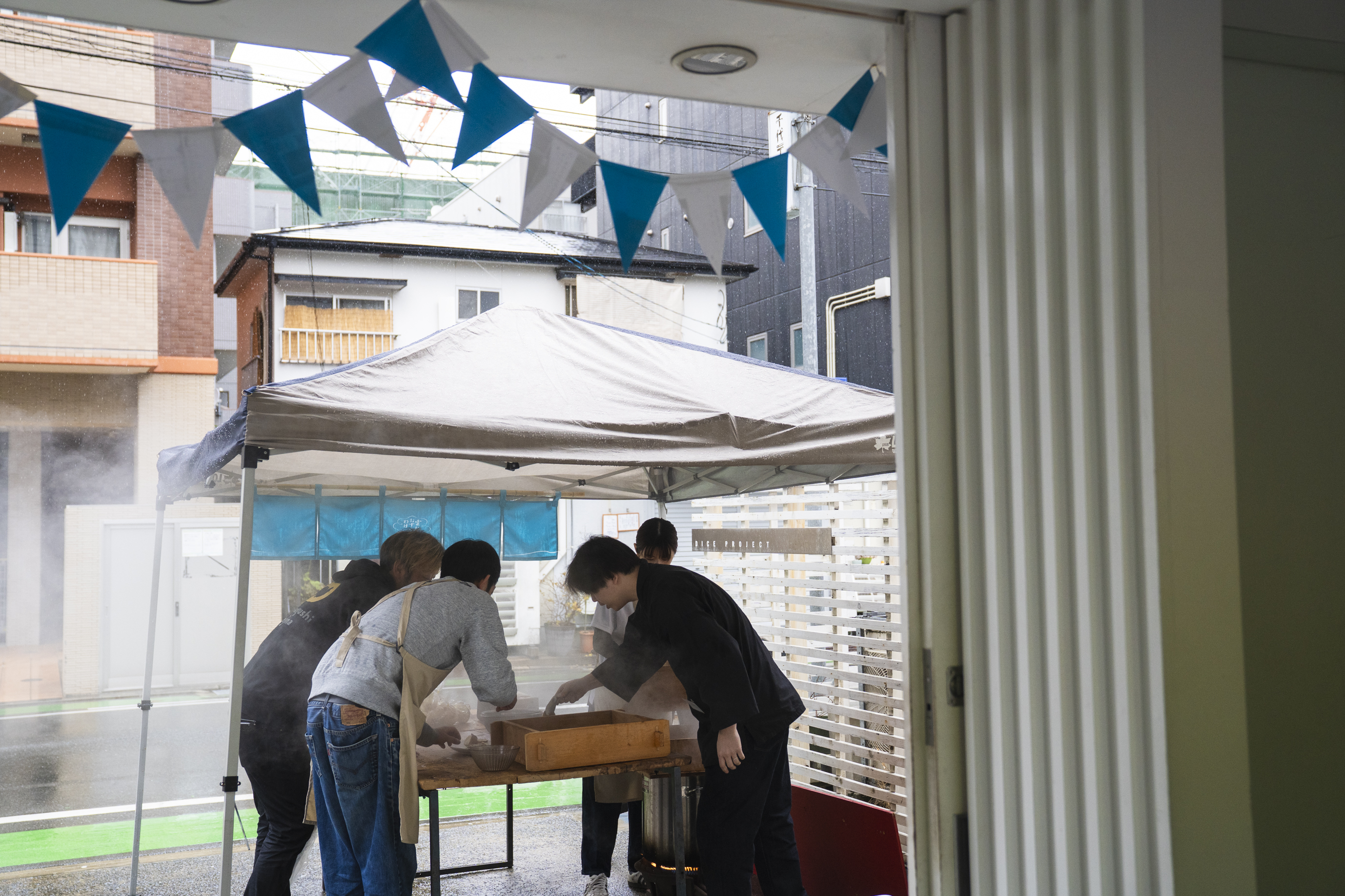 「雲仙湯けむりマルシェ」を開催する2日目は、あいにくの雨模様でした。朝はゆっくりの滑り出しでしたが、雲仙からやってきたメンバーと温泉のアツさは止まりません。温泉水をグラグラ沸かして蒸気を上げながら、「今日は雲仙食材をどうやって食べてもらおうか〜」と盛り上がるメンバーたち。